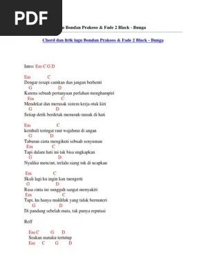 Lirik lagu, kunci/chord gitar bondan prakoso & fade 2 black : ➖ ➕ ⌛ autoscroll lirik. Download lagu bondan fade 2 black bunga lirik secara gratis, dan download mp3 bondan fade 2 black bunga lirik terlengkap, mudah, cepat dan gratis. Layanan mobile dari situs entertainment terbesar indonesia, kapanlagi.com. Untuk menemukan lirik lagu bondan prakoso lainnya cukup buka pada menu lirik . Bondan prakoso lirik lagu : Em c g d kuingin cinta ini dapat kau sambut Lirik lagu bunga bondan prakoso & fade 2 black. Em c g d dengar resapi camkan dan jangan berhenti karena sebuah pertanyaan perlahan menghampiri mendekat . Em c dengar resapi camkan. Lirik lagu bunga bondan prakoso ft fade2black from akcdn.detik.net.id em c g d em c dengar resapi camkan dan jangan berhenti g karna sebuah pertanyaan d . Ku cinta kau bunga (reff) em c g d seakan mataku tertutup. Lyrics to song bunga by bondan prakoso:
